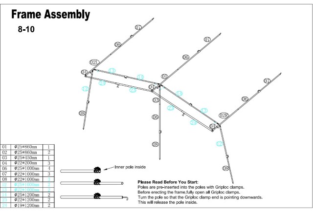 Smaller poles are pre-inserted into the larger poles with Griploc clamps
