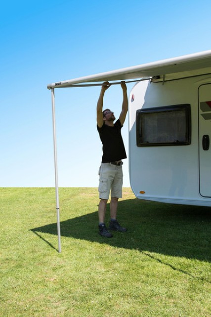 Fast and easy set-up of the awning thanks to thesimultaneous swing-out of the support and tension legs