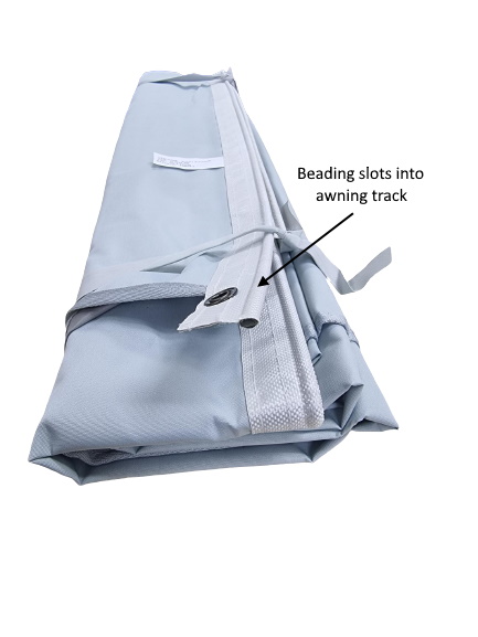 Refer to pictures 2 and 3 which shows the sewn in beading and how it fits into awning track