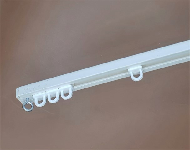 Our part number B2 curtain tape with domes fits into this track or you can use curtain gliders (does not include these)