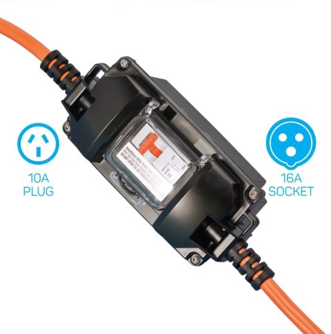 Connects a 16A caravan/motorhome to a regular 10A power outlet safely and legally