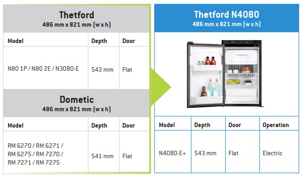Please note: The Thetford N4080E Caravan and Motorhome Fridge is now supplied with a reversible hinge as standard and as such can be installed as either a left or right handed hinge. The Thetford N4080E replaces the N3080 and N80 Fridges.