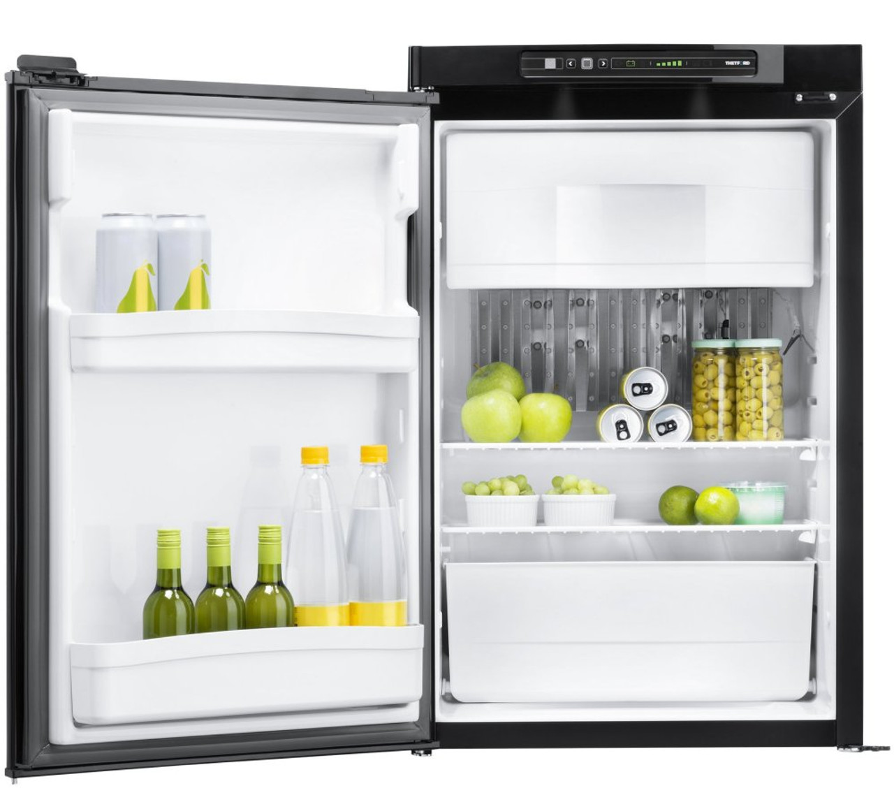 A lockable door means that the Thetford N4090 Caravan and Motorhome fridge freezer will stay securely shut whilst your vehicle is in transit, while adjustable door bins, shelving and a bottle slide will keep your goods from moving about or coming loose within the fridge.